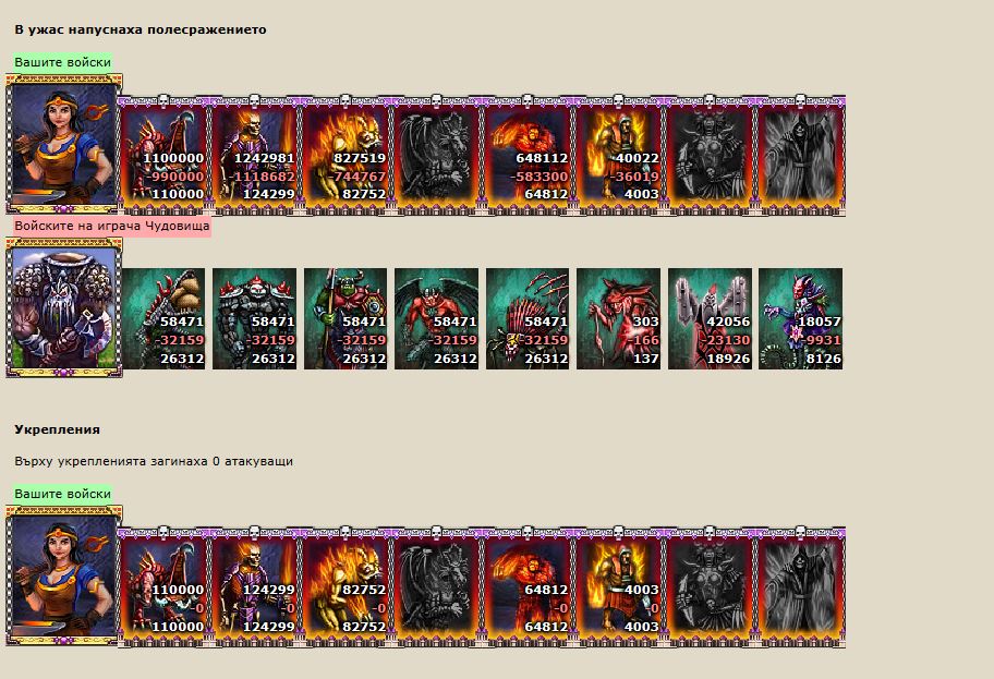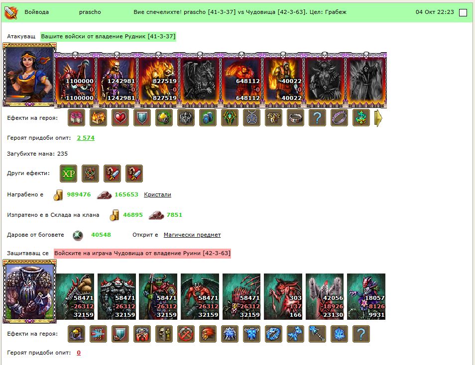Надявал съм се да се окаже в полетата около мен през всичките тези години, но съм се чудел дали ще я открия и победя пръв, при положение,че покрай подземните турнири много хора проучват полетата.В тази вечер на 4 Октомври, бях решил да дам почивка на войските и на себе си. Дори не ги бях пратил да бият някой саркофаг, докато си почивам. И това се оказа голям късмет , защото бяха в готовност да тръгнат веднага в атака към архируината. Не съм обръщал внимание с какви войски другите владетели бият архируини и за мен се оказа изненада,че не виждах точният брой на войските в руината при шпионажа. Имах активни доста заклинания. Направих и някои грешки, като активирах "Доминиране върху монстри", след като бях тръгнал в атака и това не ми помогна по никакъв начин в битката. Тези 19 минути, които смелите демонски войски пътуваха към архируината ми се видяха цяла вечност. Безброй пъти проверих дали всичко е наред. Дали заклинанията няма да са изтекли в момента на атака. Дали няма атаки от други владетели към архируината.В крайна сметка войските показаха смелост в боя и се завърнаха със слава във владенията.